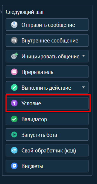2. Во вкладке «Следующий шаг» выберите блок «Условие» и добавьте в сценарий.