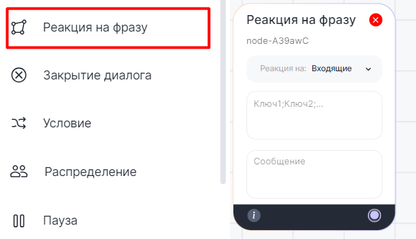 - Выберите блок «Реакция на фразу» и добавьте его в рабочую область.