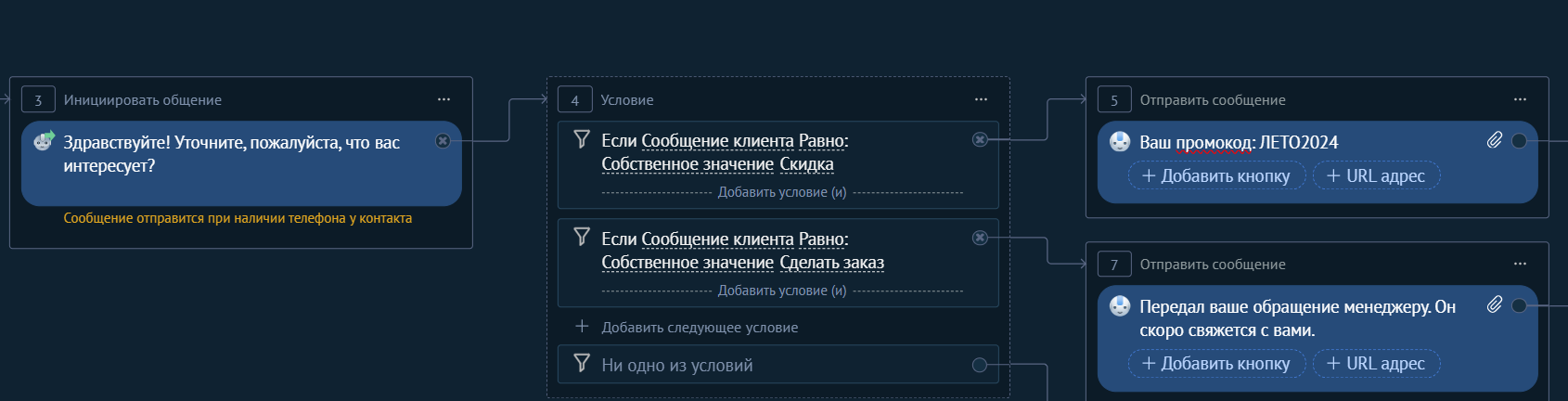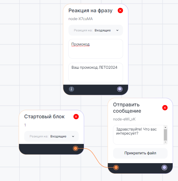 - Если клиент напишет «Промокод», то блок «Реакция на фразу» отправит название промокода.