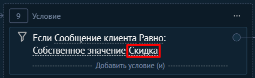 4. В поле «Собственное значение» введите слово или фразу, на которые должен реагировать бот. Например, «Скидка».