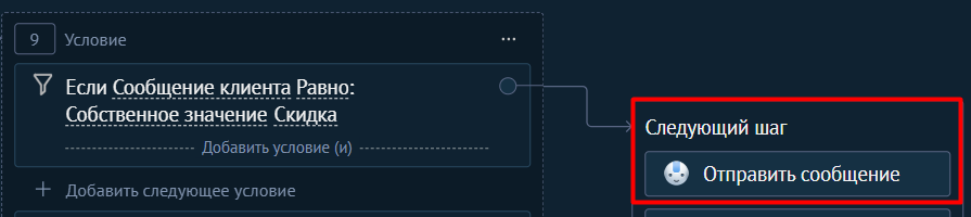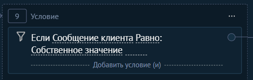 3. В блоке «Условие» в поле «Если» выберите «Сообщение клиента равно:» — «Собственное значение».