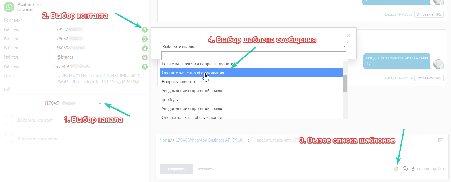 - Далее вызовите окно со списком шаблонов и выберите шаблонное сообщение.