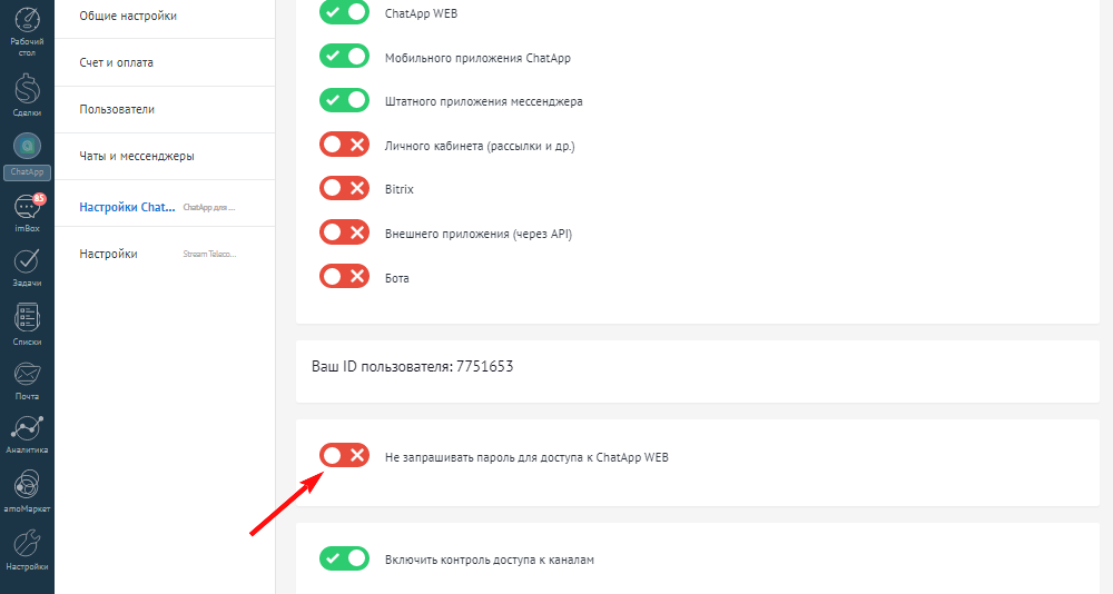 В настройках интеграции ChatApp отключите опцию «Не запрашивать пароль для доступа к ChatApp Dialog».
