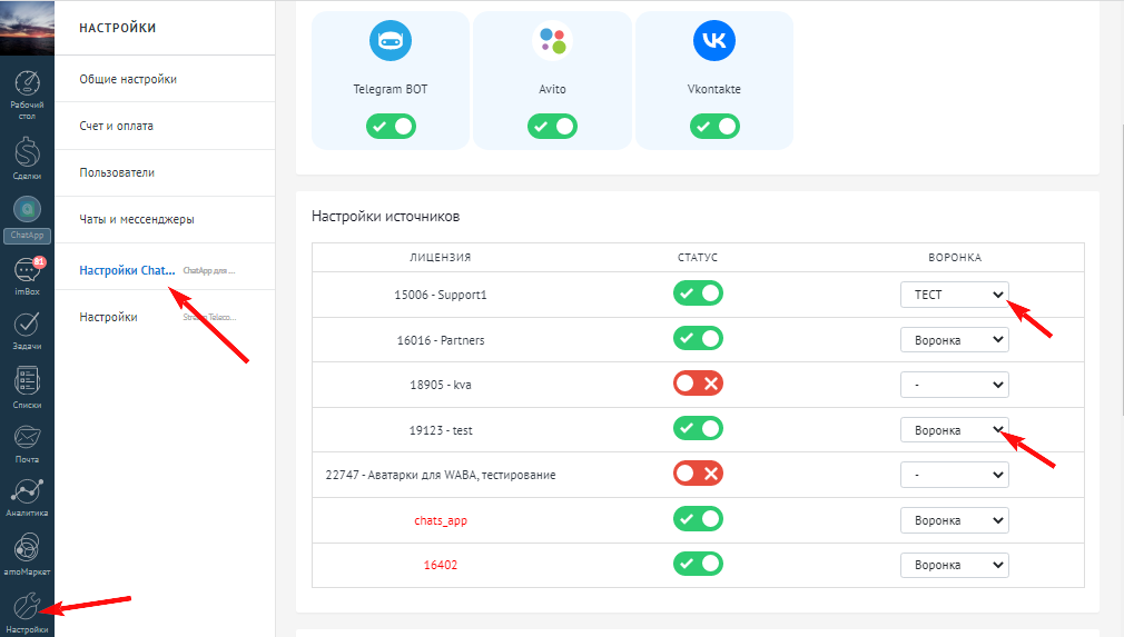 В настройках интеграции ChatApp, напротив каждой линии выберите необходимую воронку.