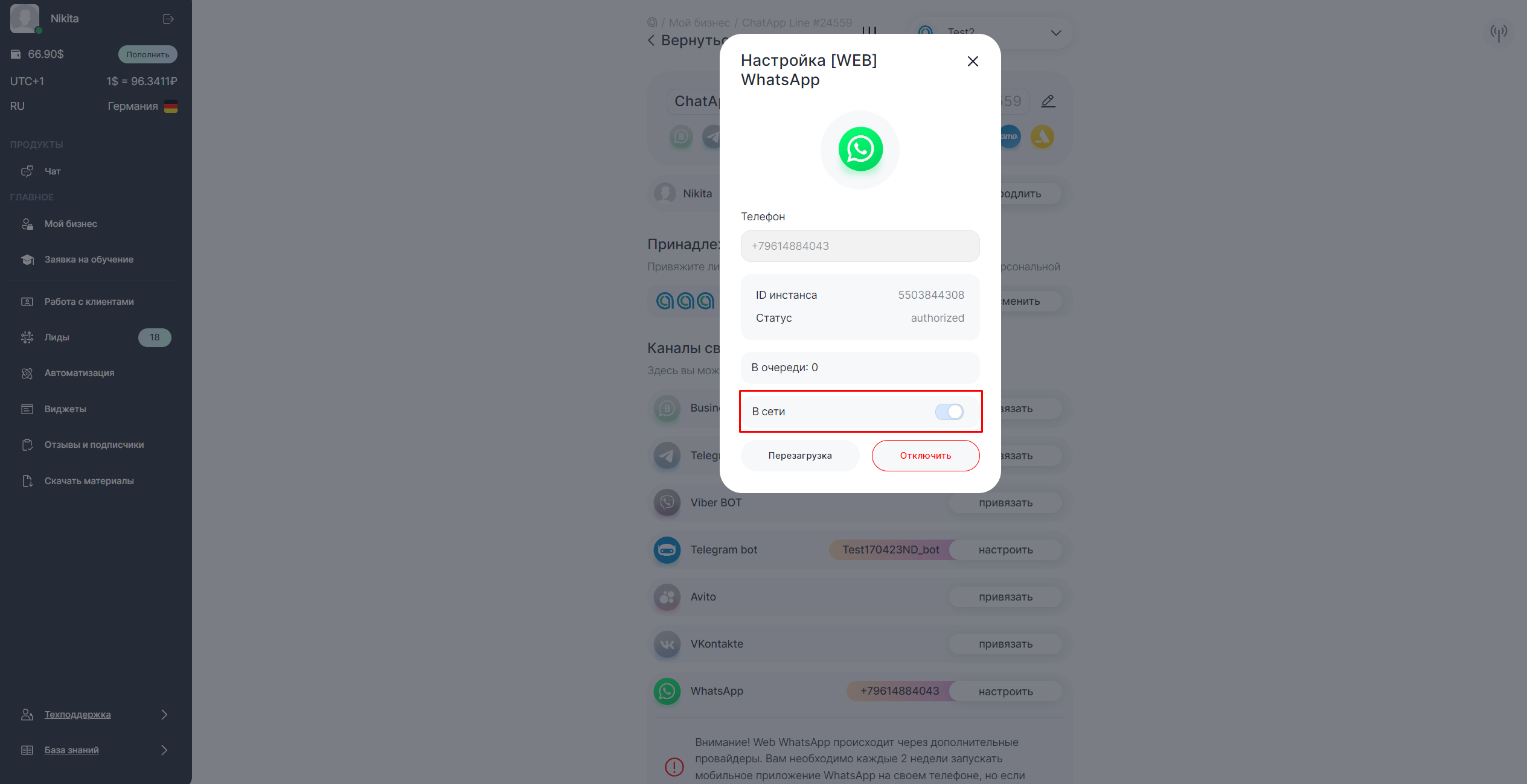 Если не заходить в WhatsApp 14 дней, то интеграция снова может отключиться.