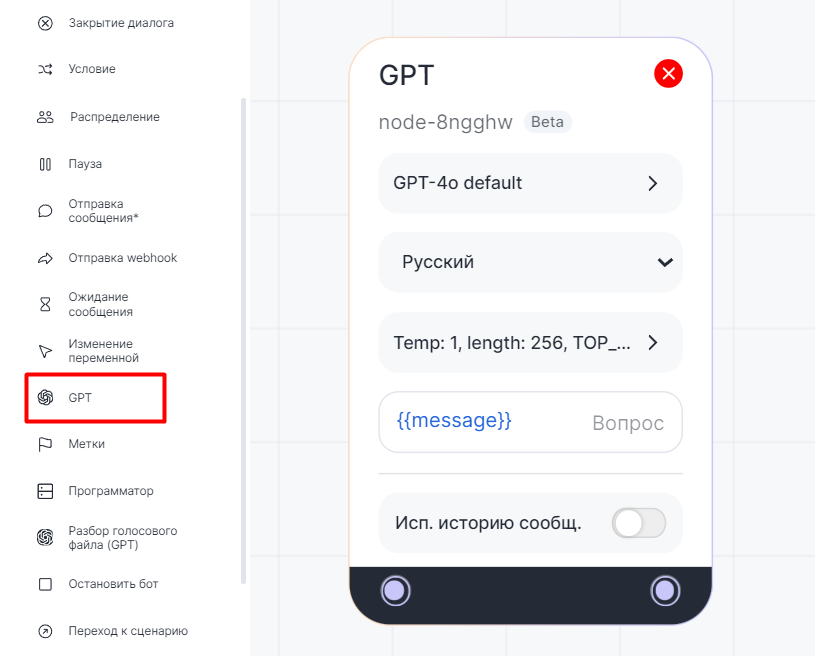 - Выбор модели — модель GPT, которая будет отвечать клиенту;