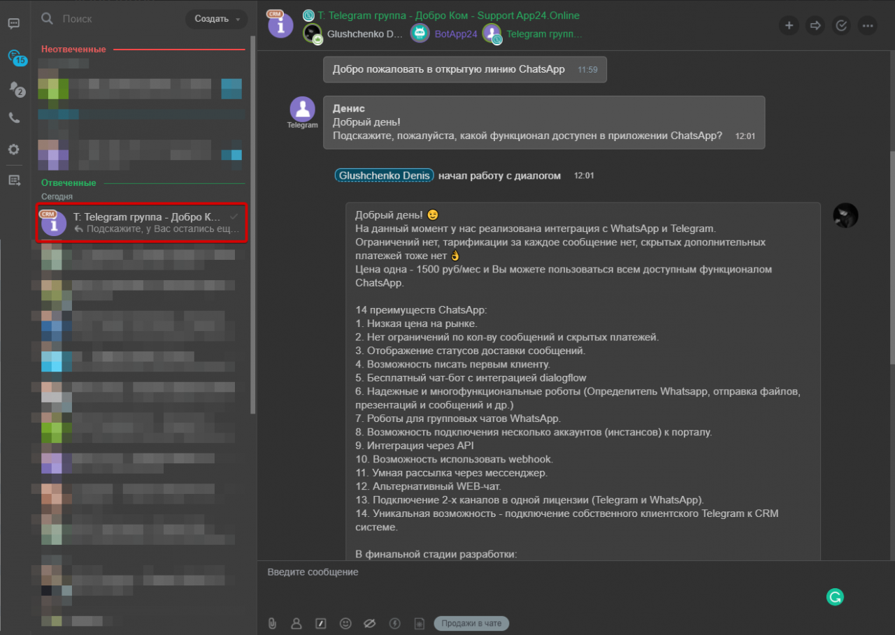 В окне мессенджера Бирикс24 появится чат: