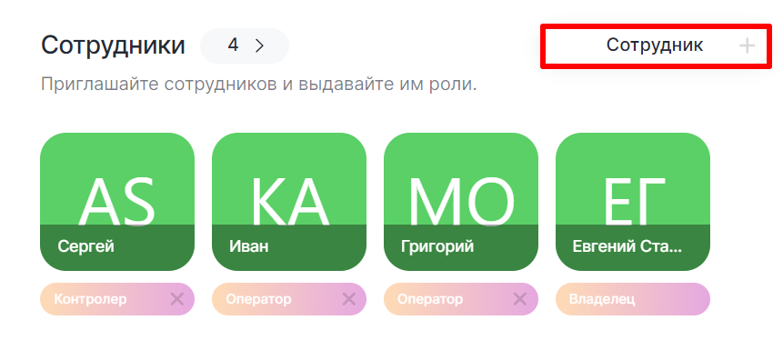 2. Если в разделе «Роли» пусто, создайте роль. Затем нажмите на кнопку «Сотрудник +».