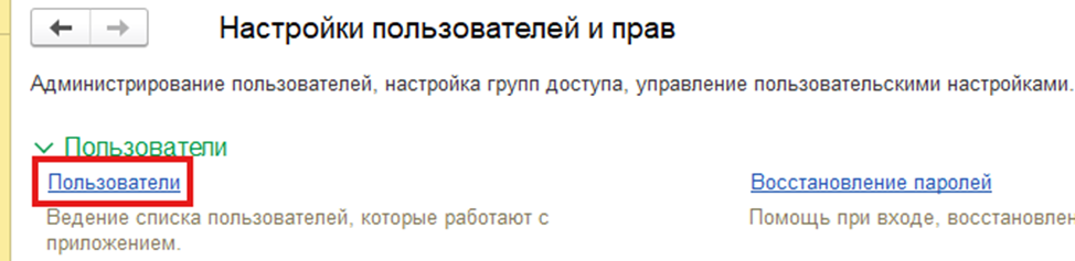 Далее в окне «Настройки пользователей и прав» требуется перейти в раздел «Пользователи»