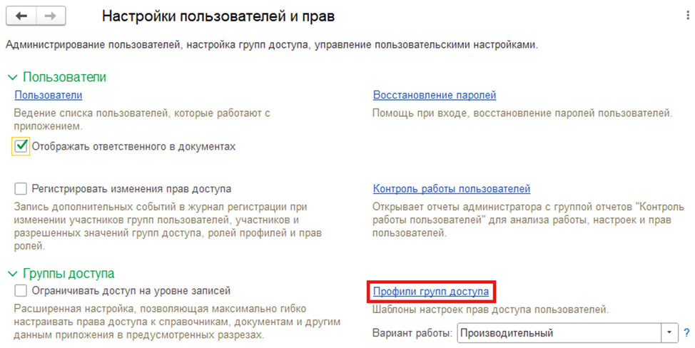 В открывшемся окне «Настройки пользователей и прав» требуется перейти в раздел «Профили групп доступа»