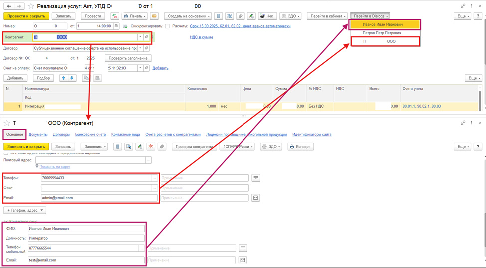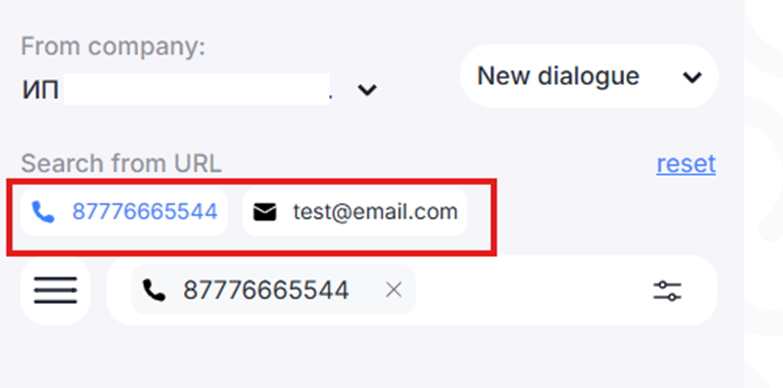 После нажатия на кнопку перехода в Dialogs произойдет открытие системы с доступными фильтрами по контактной информации контрагента или его контактного лица