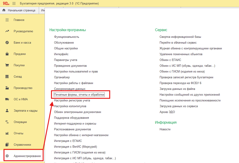 Для подключения расширения требуется перейти в подсистему «Администрирование» и выбрать пункт «Печатные формы, отчеты и обработки».