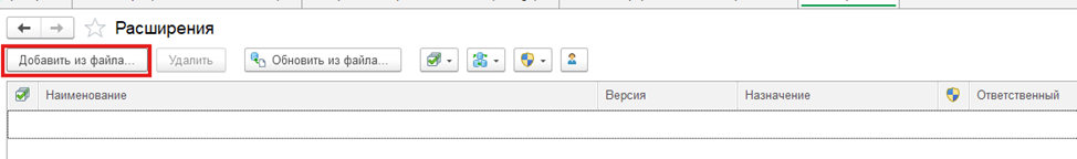В окне «Управление расширениями конфигурации» необходимо нажать кнопку «Добавить»