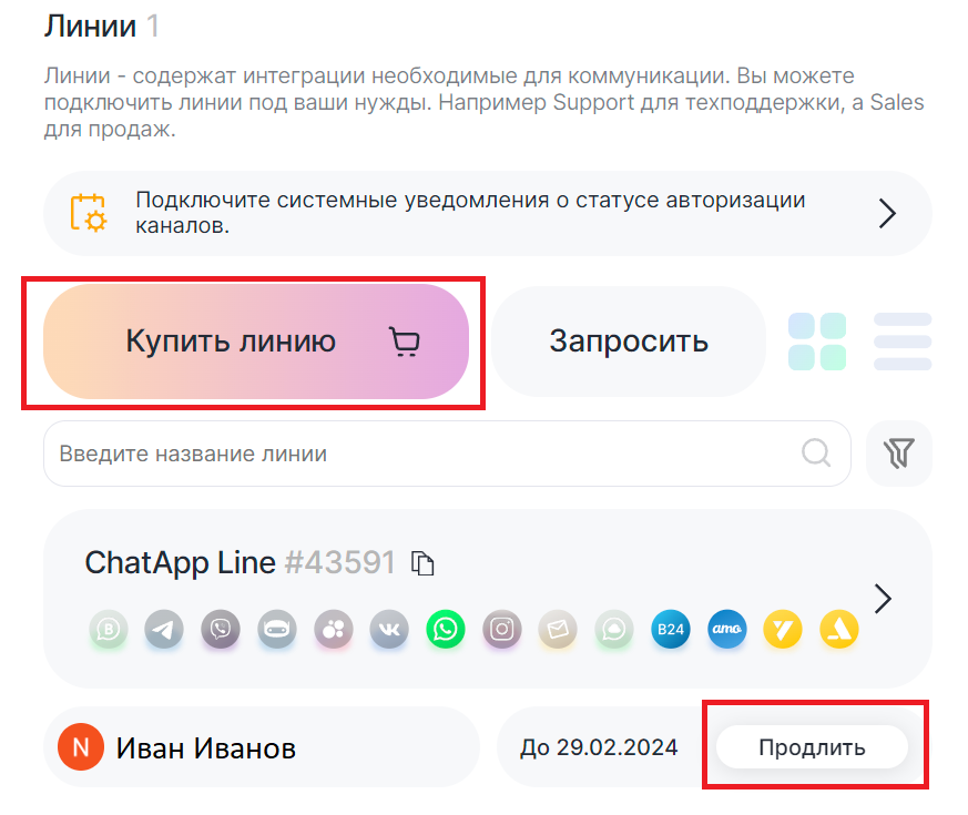 - Нажмите «Купить линию» или «Продлить» возле купленной линии.