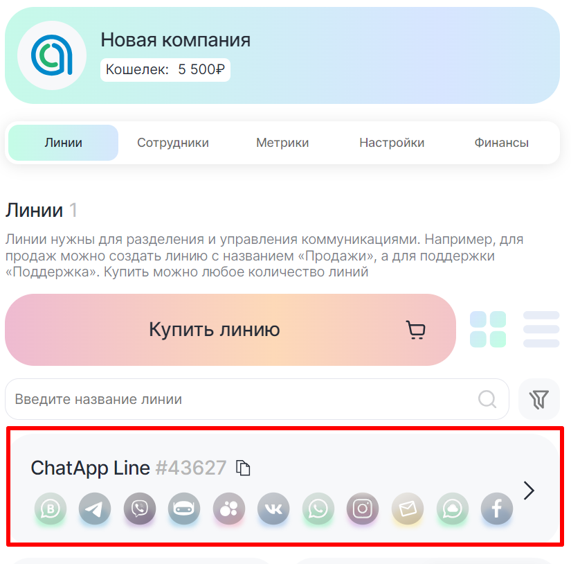 1. В Личном кабинете перейдите в раздел «Выбранная компания» и выберите линию с подключенным Telegram personal.