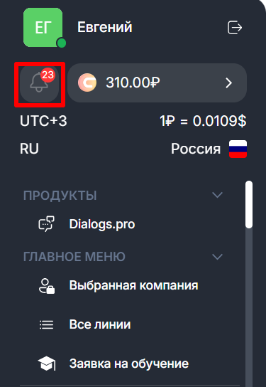 - Системные уведомления — о статусах каналов и линий, авторизации, смене пароля, изменениях профиля. Выделяются жёлтым цветом