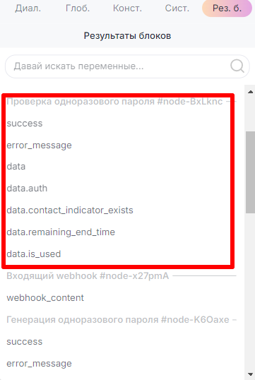 - После того, как блок отработает в сценарии, можно получить результаты.
