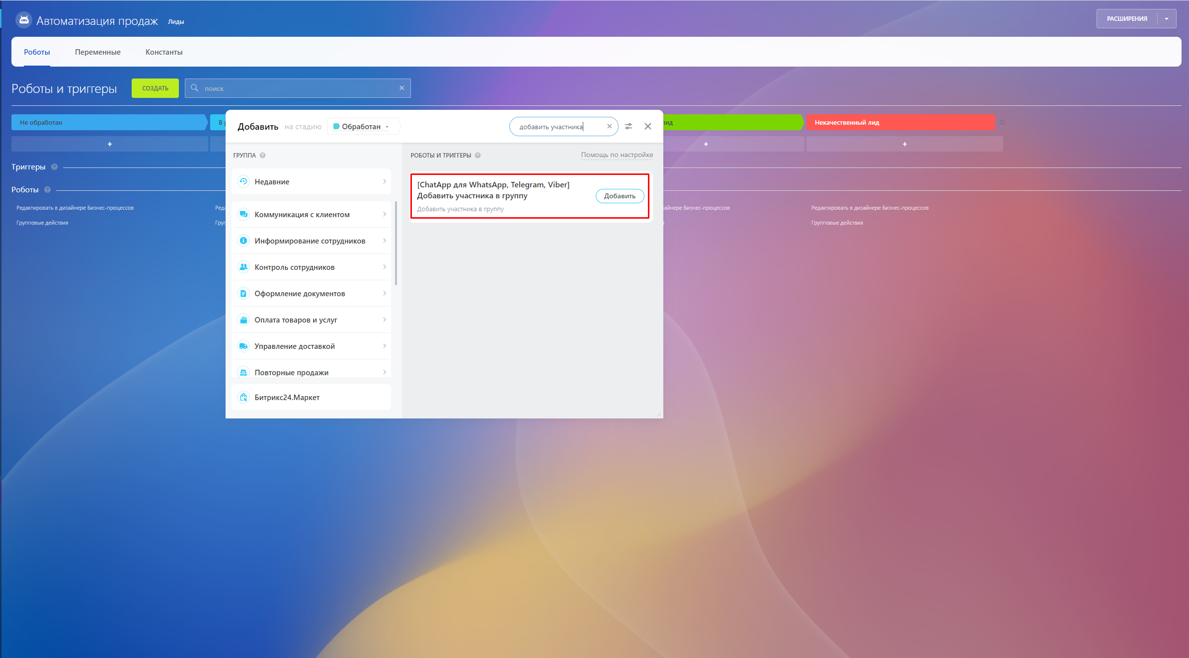 - Добавьте робота ChatApp - Добавить участника в группу в сделку.