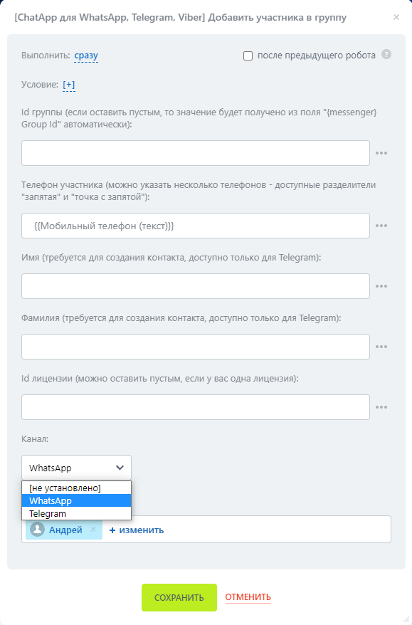 Робот ChatApp - Добавить участника в группу, автоматически добавляет в группу WhatsApp или Telegram нужного пользователя.