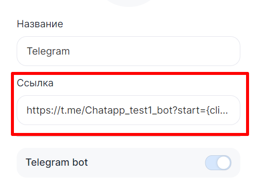 Для Telegram Bot параметр нужно добавить clientId в ссылку, например: https://t.me/Chatapp_test1_bot?start={clientId}.