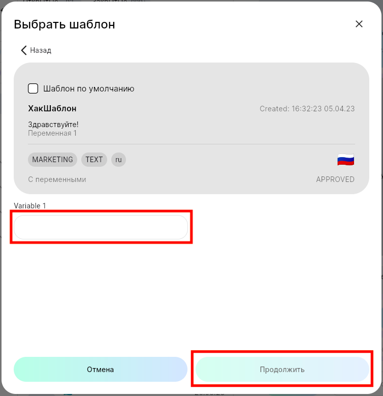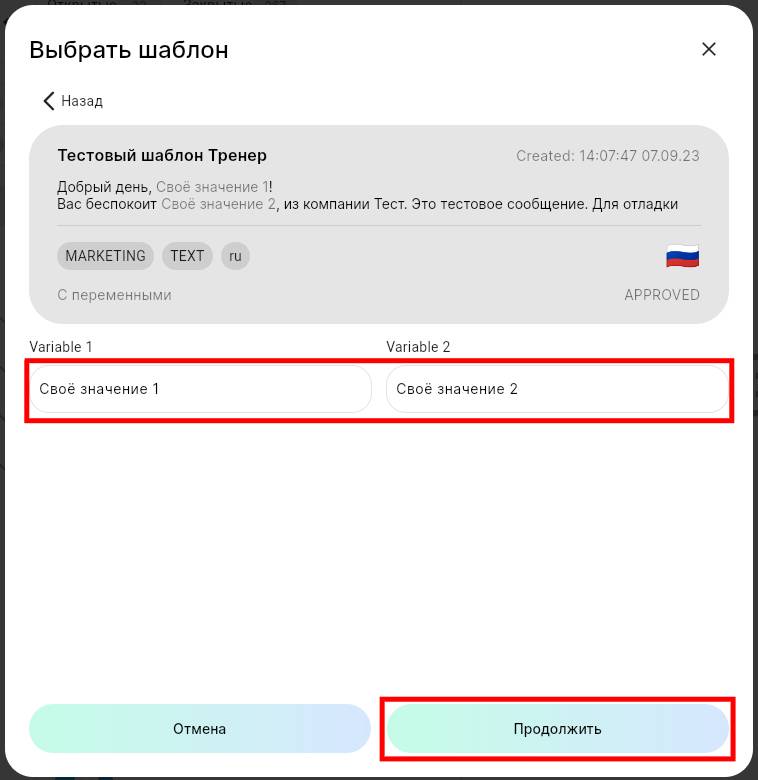 Перед отправкой шаблона проверьте, подключен ли у вас канал WhatsApp Business API (GupShup) и созданы шаблоны с переменными.