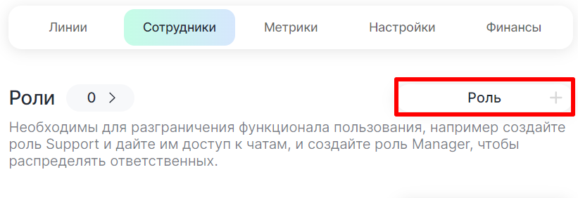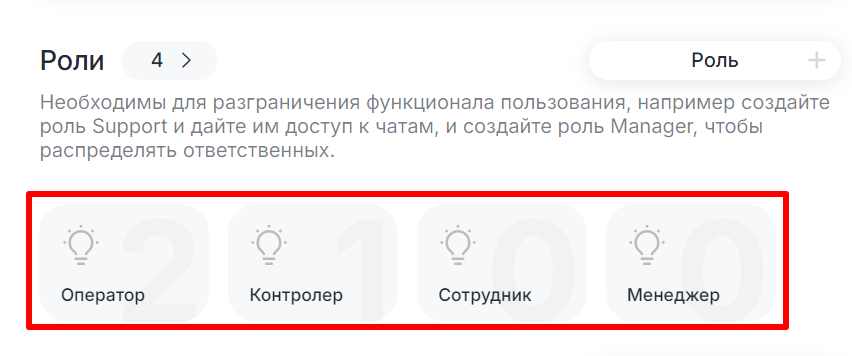 Для начала создается роль. Это нужно для разграничения функционала, например создайте роль «Оператор» и дайте доступ к чатам. Создайте «Менеджер», чтобы распределять ответственных. Затем пригласите сотрудников и выдайте доступы «Оператор» или «Менеджер».