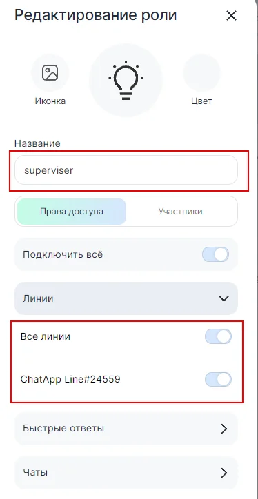 6. Во вкладке «Чаты» настройте права доступа. Для этого переведите ползунки в правое положение напротив разрешений, которые хотите выделить для этой роли. Внизу нажмите «Готово».