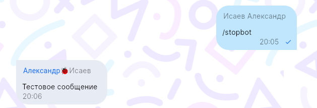 Как выглядит диалог для пользователя (команда /stopbot не отображается):