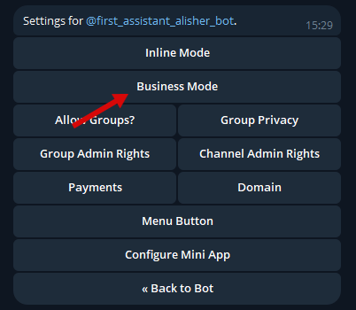 - Нажмите «Business Mode» для подключения бизнес-режима для чат-бота.