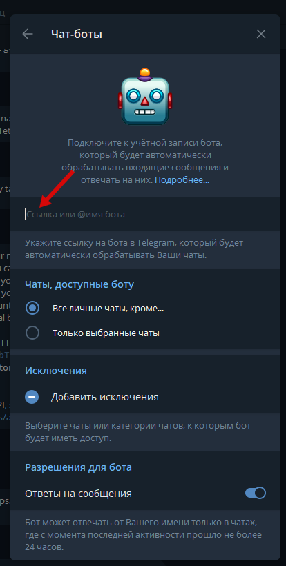 - Укажите ссылку необходимого чат-бота или его имя.