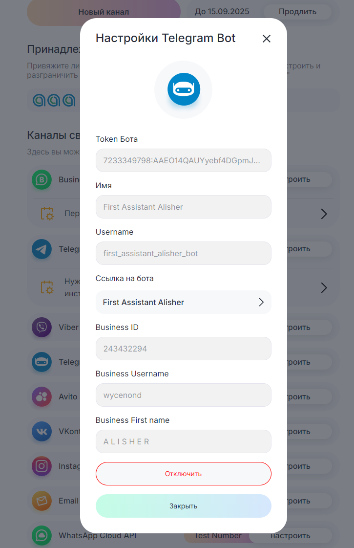 Готово! Теперь в настройках канала в Telegram Bot будет указан Business ID и имя владельца бизнес-аккаунта.
