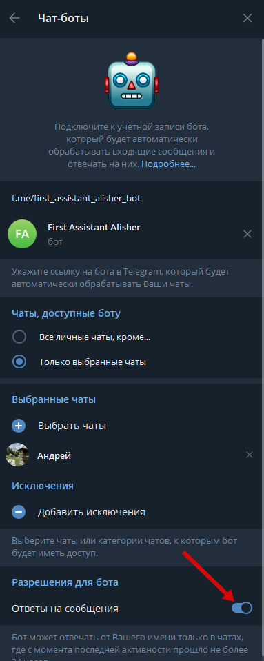 После привязки чат-бота к бизнес-аккаунту, нужно поменять настройки бота в BotFather.