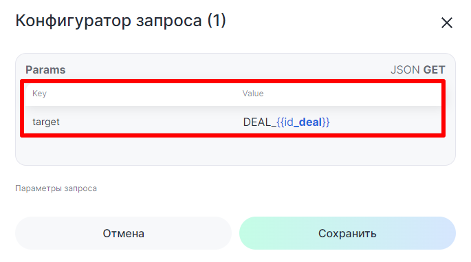 2. В поле «Params» добавьте «target» под «Key» и «DEAL_{{id}}» под «Value».