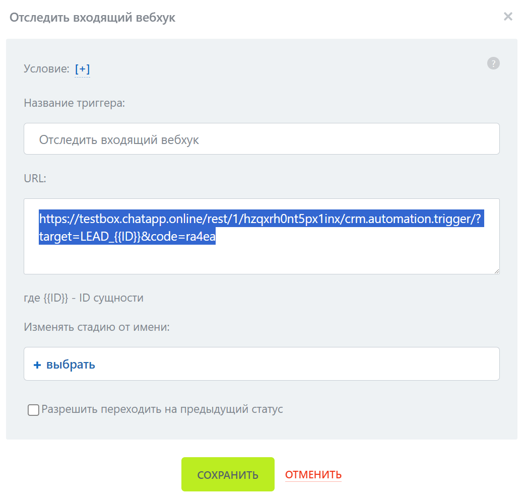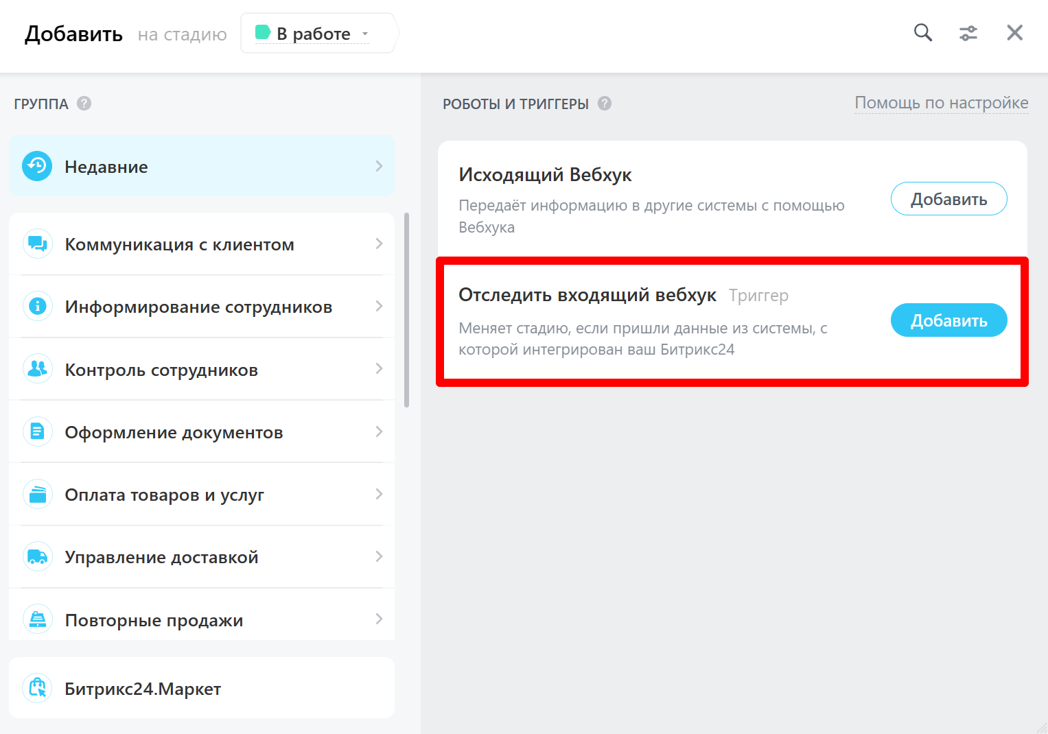 6. Создайте триггер «Отследить входящий Вебхук» на этапе сделки, где хотите ее переместить при прочтении сообщения. Нажмите на синюю надпись «Добавить».