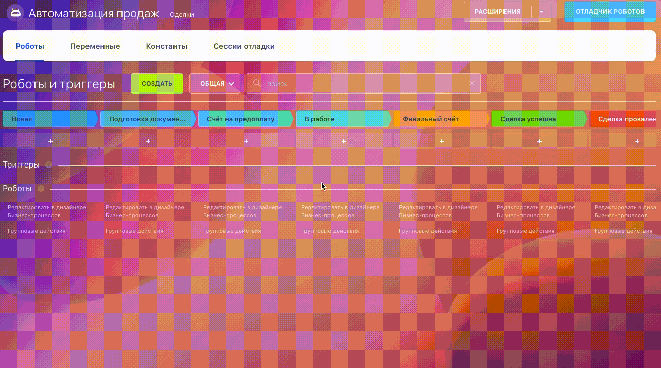 Действие, которое возникает в результате триггера, включает в себя передвижение сделки по стадиям воронки продаж. Этот процесс состоит из двух этапов: сначала создается событие в Конструкторе ботов, а затем настраивается действие в Битрикс24.