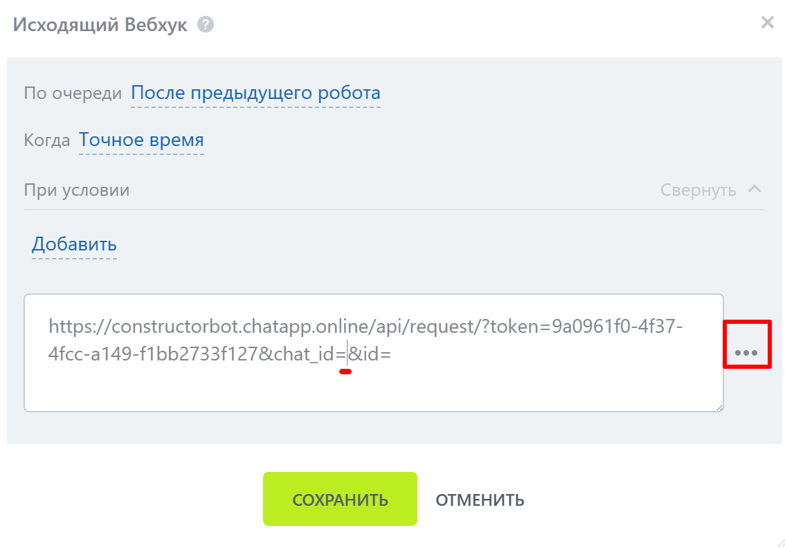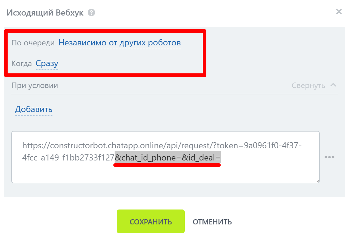 4. Вставьте скопированную ссылку (на сценарий бота) в поле «Хендлер» в роботе «Исходящий Вебхук» в Битрикс24. В пункте «По очереди» выберите — Независимо от других роботов, а в пункте «Когда» — Текущее время (Сразу). Дополните ссылку переменными как показано в примере.