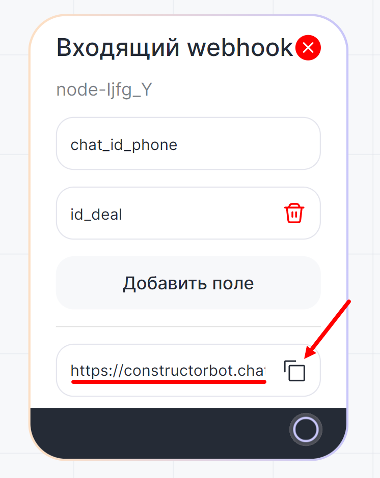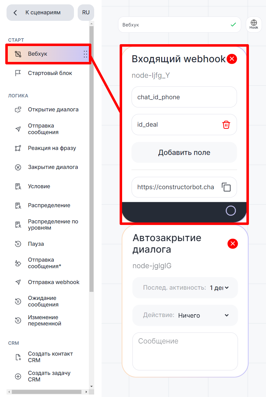 1. Добавим две переменные для получения контактных данных. Добавьте 2 поля с переменными: «chat_id_phone» и «id_deal» в блок «Входящий Webhook».