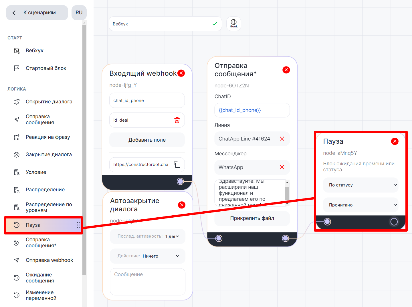 В Конструкторе ботов можно настроить реакцию на статус сообщения. Это делается в блоке «Пауза», где можно выбрать нужный статус, например, «Доставлено» или «Прочитано». Следуйте инструкции:
