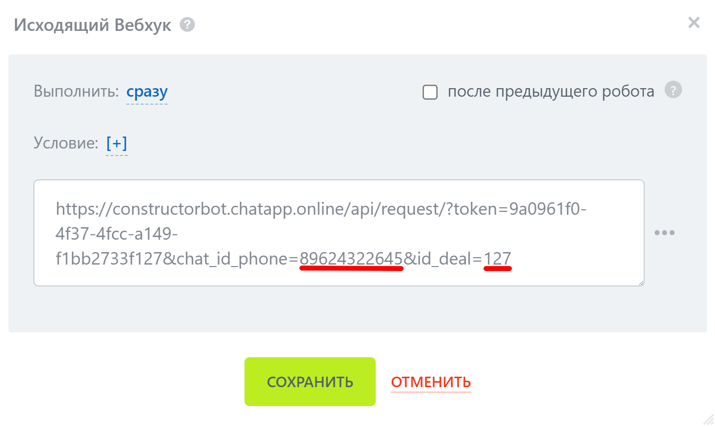 5. Поставьте курсор после «chat_id_phone=» и нажмите на кнопку. Через поиск найдите переменную «Телефон (текст)». Поставьте курсор после «id_deal=» и введите id сделки. Сохраните настройки.