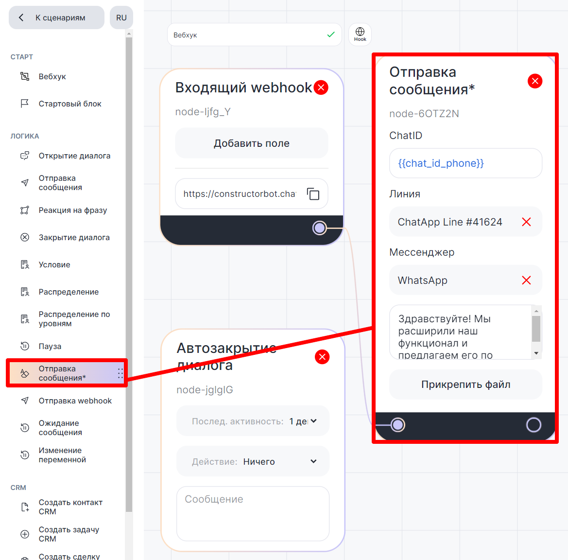 3. Установите блок «Отправка сообщения*»: Используйте переменную «{{chat_id_phone}}», выберите мессенджер и напишите текст сообщения для отправки сообщения конкретному пользователю.