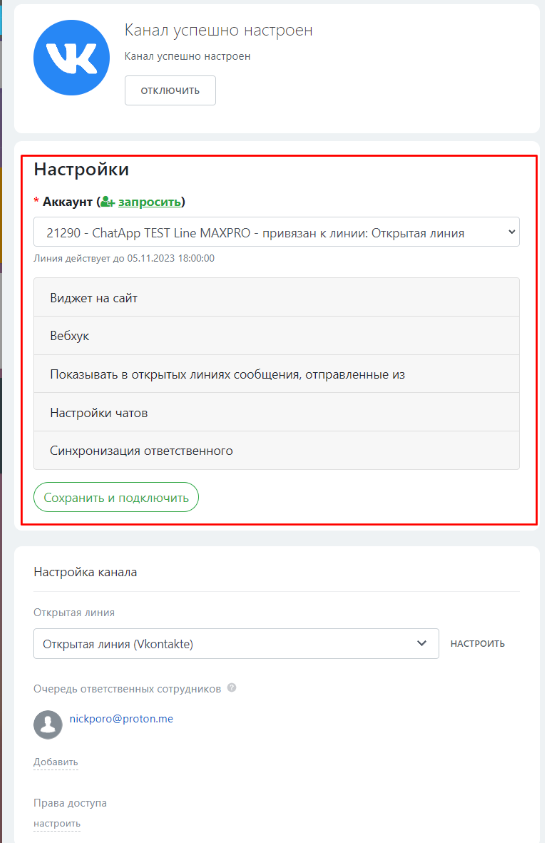 - подключен канал Vkontakte в Личном кабинете ChatApp;
