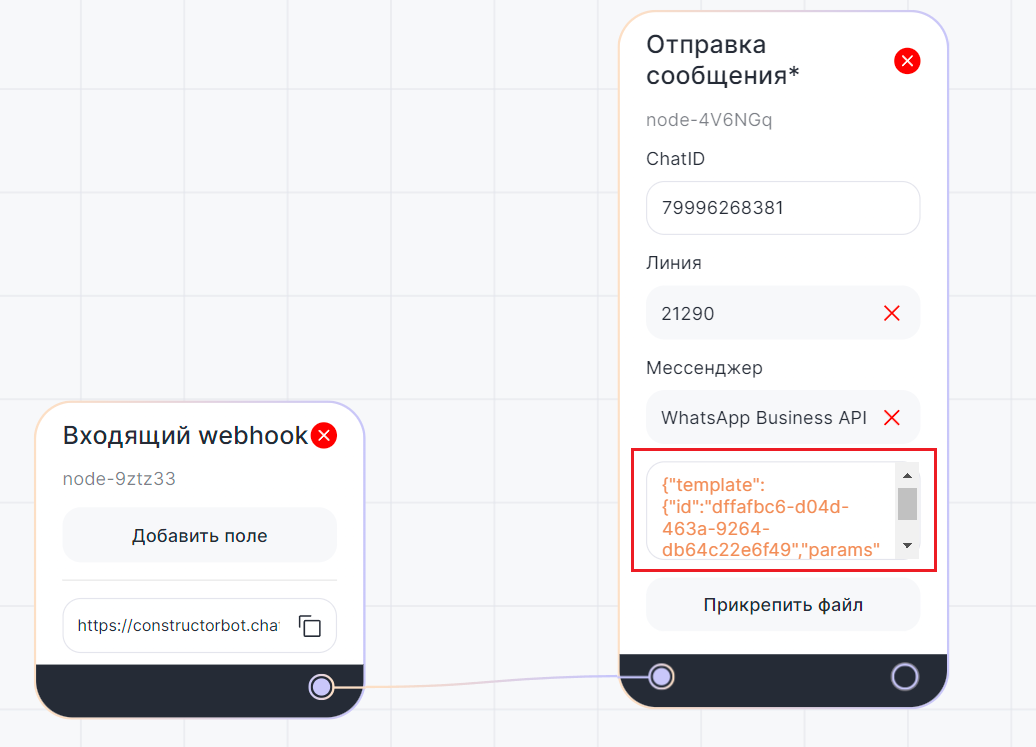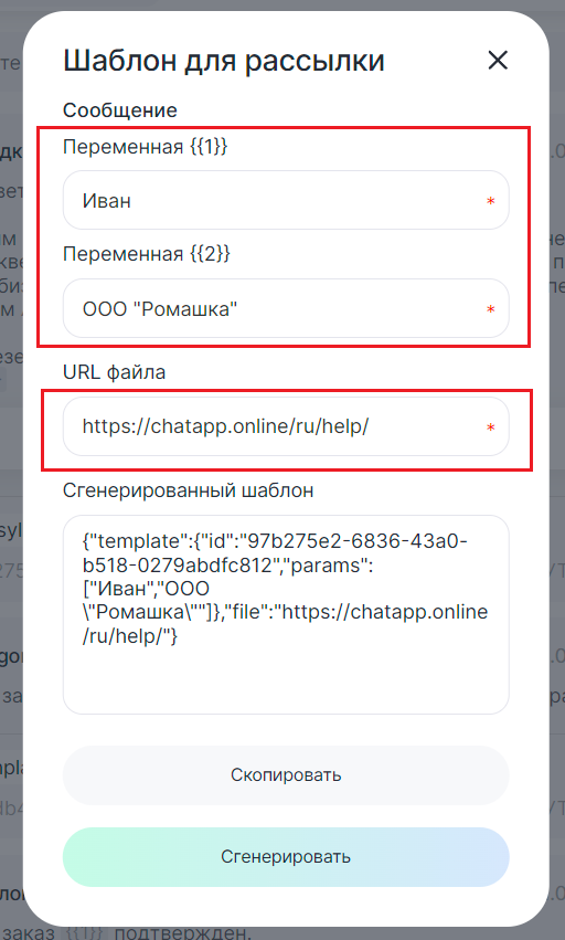 Пример кода шаблона: {"template":{"id":"97b275e2-6836-43a0-b518-0279abdfc812","params":["Иван","ООО \"Ромашка\""]},"file":"https://chatapp.online/ru/help/"} |