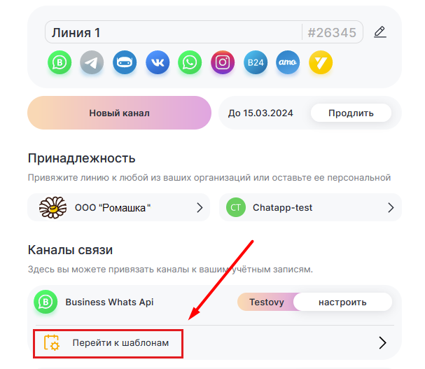 1. Зайдите в линию с подключенным WABA и нажмите «Перейти к шаблонам».