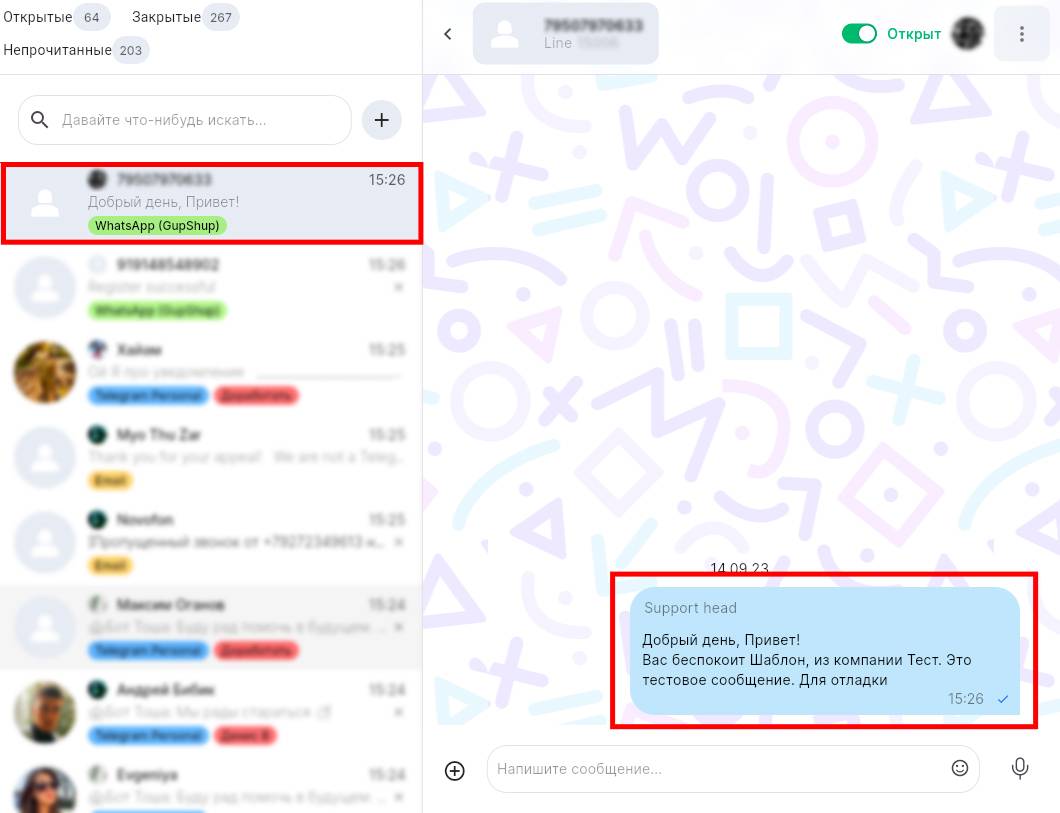 8. Откроется созданный диалог с отправленным шаблоном.