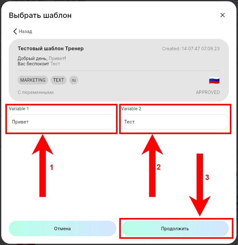 6. Выберите нужный шаблон. Если присутствуют переменные, заполните их. Нажмите «Продолжить».