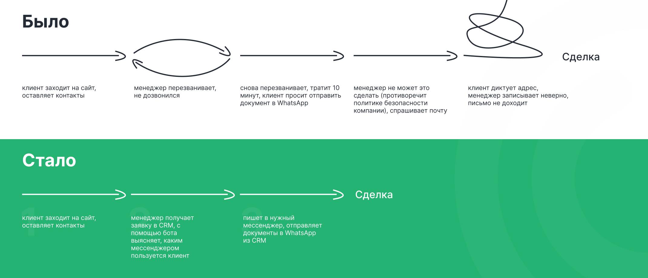- клиенты просили написать в WhatsApp или Telegram – использование личных аккаунтов противоречило политике безопасности и не позволяло контролировать действия менеджеров.