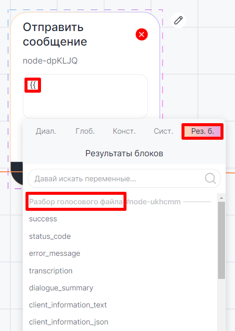 4. Чтобы вставить в блок «Отправка сообщения» результат обработки сообщения, введите две фигурные скобки «{{» и в выпадающем меню нажмите «Результаты блоков». В разделе «Разбор голосового файла» выберите нужный результат: