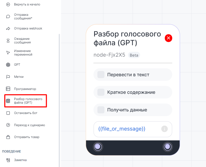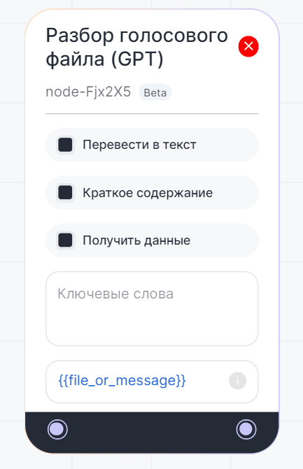 - Поле выбора файла или текста — для анализа блоком. По умолчанию в нем переменная «file_or_message» — принимает значения аудио и текста. В поле можно добавить ссылку на аудиофайл, вписать текст или переменную — свою либо системную: {{message}} (текст), {{file_link}} (ссылка на аудио файл), {{file_or_message}} (аудио или текст).