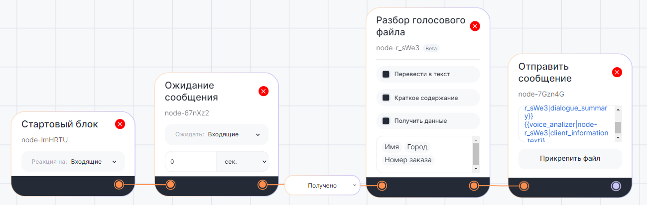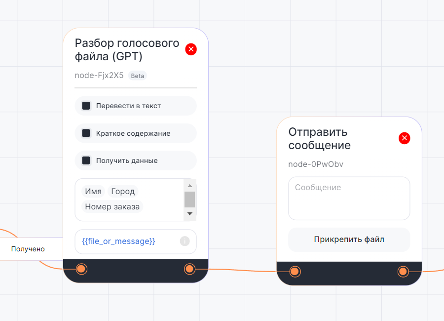 3. Результат обработки сообщения блоком «Разбор голосового файла (GPT)» можно сохранить в блок «Отправить сообщение».