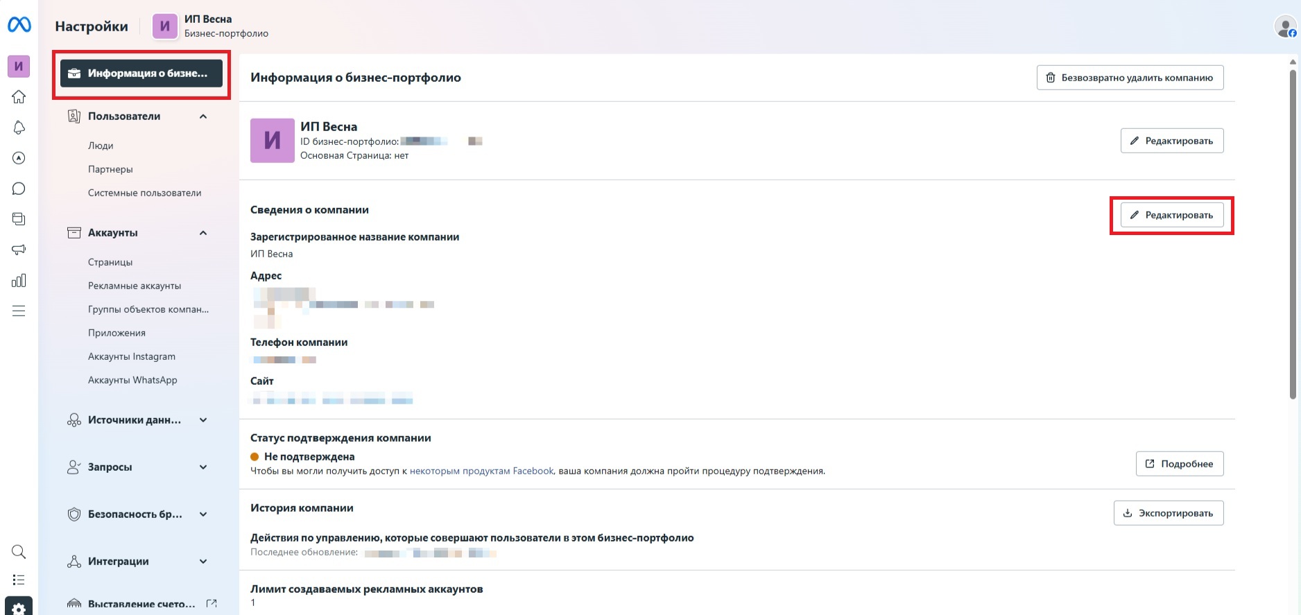 2. В меню управления слева найдите пункт «Информация о бизнес-портфолио». Откроется вкладка со сведениями о компании.